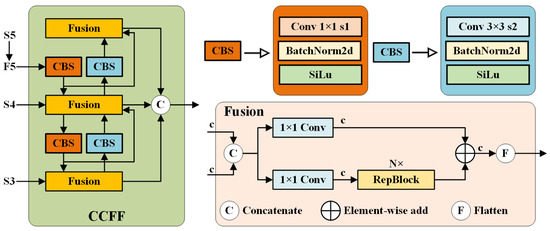 Refer to Figure 3 for the CCFF structure’s treatment of the F5 layer. We apply 1 × 1 convolution to the output feature maps of SPPF in the YOLOv8 model to reduce the number of channels of the output feature maps from 1024 to 256 while keeping the input dimensions unchanged. This reduces the model’s parameter count and achieves the linear combination of the information between the channels, facilitating cross-channel interaction. In addition, further drawing on CCFF’s treatment of S3 and S4, we perform 1 × 1 convolutional dimensionality reduction on the output features of layers 4 and 6 of the YOLOv8 model’s backbone network and fuse them with the processed features at other scales. Finally, the deep feature map is combined with the feature map after upsampling. This cross-layer connection design not only expands the model’s perceptual scope but also allows it to utilize both high-resolution details and low-resolution semantics, thereby enabling multi-scale adaptability for wafer defect recognition.
