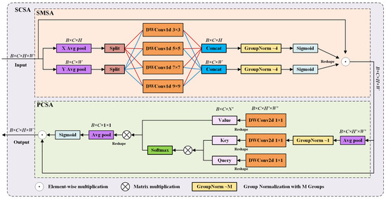 In addition, to further strengthen the model’s feature expression and elevate its performance in industrial defect detection, we introduce a lightweight and practical spatial and channel synergistic attention (SCSA) [26] module in the above-improved neck part. The SCSA module enhances feature expression through the synergy between shareable multi-semantic spatial attention (SMSA) and progressive channel-wise self-attention (PCSA), as shown in Figure 4. Given the input , SMSA decomposes the input feature into K independent sub-features along the height (H) and width (W) dimensions and . Then, 1D DWConv is employed to capture spatial structural information across various semantic layers. Next, convolution kernels of various scales (3, 5, 7, and 9) are applied to each sub-feature and .