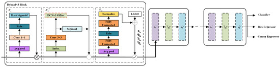 To summarize, we apply the above three attention mechanisms to Equation (16) sequentially and stack the , , and modules to construct a head network called dynamic head deformable convolutional networks v3 (DyHeadv3). Finally, the sequentially stacked DyHeadv3 is applied to the single-segment detection model YOLOv8, as shown in Figure 5. The improved DyHeadv3 bolsters the model’s robustness against complex geometric transformations and offset prediction and further delivers a notable improvement in detection accuracy.