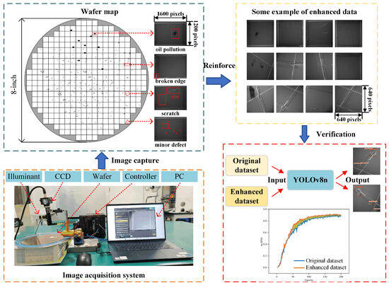 Given the scarcity of publicly accessible defective die datasets, we have curated a novel wafer surface defect dataset (WSDD) from a semiconductor company in Shanghai to assess the proposed model’s performance. The image acquisition system and capturing process are shown in Figure 6. The system is equipped with a CA-H500M industrial camera from Keyence Corporation (Osaka, Japan), which has a pixel cell size of 3.45 m, an 8× telecentric coaxial lens with a field of view of 0.9 mm × 1.1 mm, and a camera resolution of 0.43 m/px; the object distance between the camera and the wafer is set to 64 mm. The positional accuracy is 1.29 m when evaluated at 3 px. The final output image has a resolution of 1600 × 1200 pixels. Based on the properties of the images, we further classified the acquired 1021 defect images into the following four categories of defects.