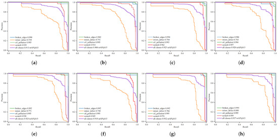 Notably, as observed from the precision–recall (P-R) curves in Figure 7, the curve corresponding to each improved model (from a to h) lies closer to the upper-right corner, indicating that the model exhibits a more favorable trade-off between precision and recall. The final model h achieves the most significant area under the curve (AUC), which implies its ability to detect more targets accurately, with fewer false positives or false negatives. Specifically, for the small defect category, the improvement in the AP50 is significant, as reflected in the enhanced performance curves for categories such as “minor defects”. The consistent overall improvement in the curves verifies that each module contributes to more effective multi-scale and small-target detection, thus confirming the effectiveness of each component in the ablation study.