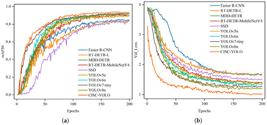 Figure 8 illustrates the growth trends of the mAP50 metric and the convergence rates of the validation loss for all models listed in Table 4 during the target detection task. Figure 8a shows that CISC-YOLO achieves an mAP50 of over 80% within 60 training epochs, outperforming other detection models; its curve exhibits a pattern of rapid increase and smooth convergence, which indicates that the model possesses excellent feature extraction capabilities in the early stages of training and confirms that the proposed dynamic feature fusion strategy can effectively accelerate model learning. The curves of Faster R-CNN, RT-DETR-L, and SSD exhibit slow growth with large fluctuations, necessitating 140–160 training epochs to achieve the same level of accuracy, which highlights their unstable training nature. In addition, the loss curves of the baseline models YOLOv8n and CISC-YOLO in Figure 8b are smoother and they perform better compared with other models; notably, CISC-YOLO has the fastest loss reduction rate and the lowest final loss value, which means that the model can significantly shorten the training cycle and reduce the training costs. In summary, this further confirms that CISC-YOLO is superior to the aforementioned mainstream models in terms of accuracy, convergence speed, and lightweight performance, making it more suitable for real-time deployment in industrial inspection scenarios.