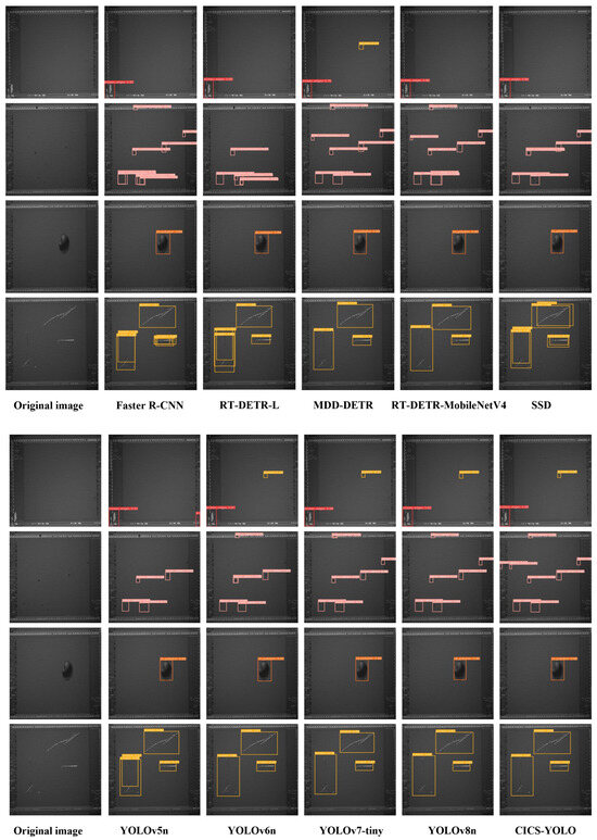 The visualization results show that, in the detection of oil-type defects on wafers, Faster R-CNN, RT-DETR-L, RT-DETR-MobileNetV4, SSD, and YOLOv5n can achieve relatively high accuracy; however, they have obvious limitations in handling small-scale targets, resulting in multiple missed detections. In addition, when identifying two types of dense targets, these models have insufficient confidence in distinguishing between targets and complex backgrounds, which in turn leads to overlapping prediction boxes. MDD-DETR, YOLOv6n, YOLOv7-tiny, and YOLOv8n have improved issues such as missed detections and redundant bounding boxes; however, for minimal defects that are obscured by background noise or fused with the background, there are still a small number of missed detections, and the models struggle to achieve accurate differentiation. In contrast, the CISC-YOLO model proposed in this study achieves accuracy of over 90% in various defect detection tasks. In terms of tiny defect detection, it effectively solves problems such as missed detections, false detections, and overlapping prediction boxes, with comprehensive performance superior to that of other mainstream models.