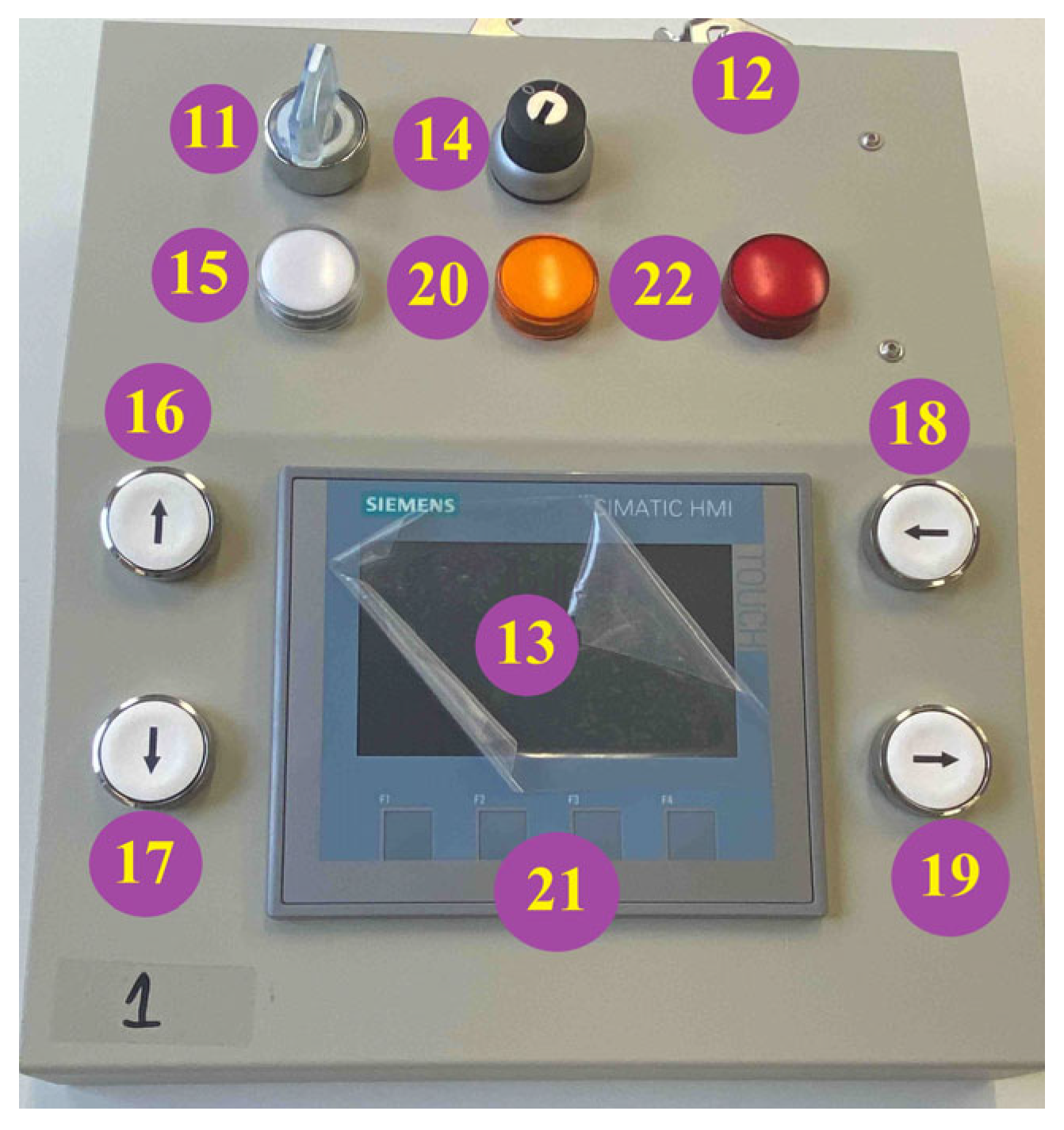 Figure 4(right)), there is a Siemens controller S7-1200 with expansion module CB1241, an industrial Siemens Switch, main fuses and fuses, relays of the safety system, and two inverters (LG iG5a-SV022IG5A-4) [