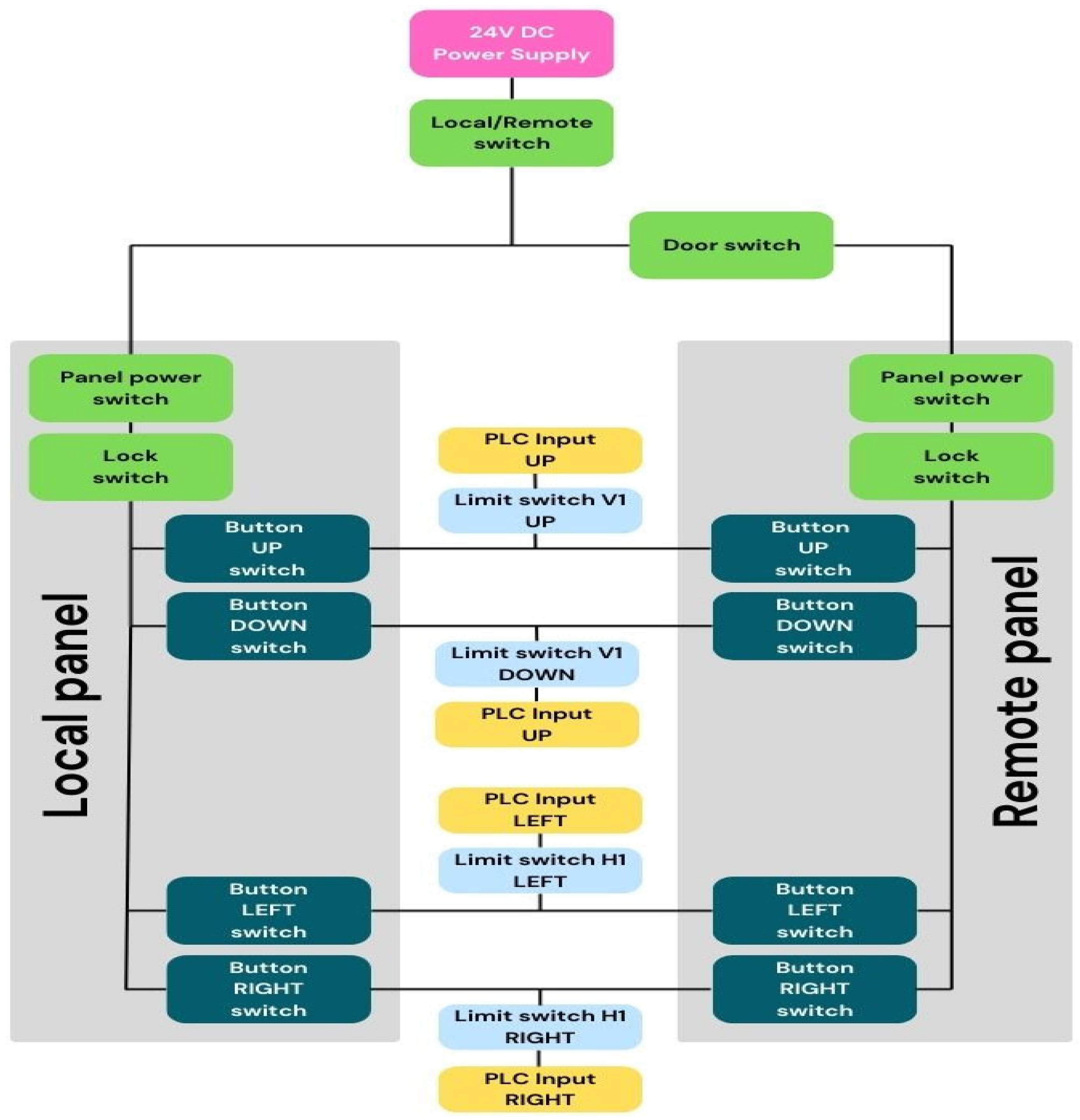 Figure 5—(16, 17, 18, 19)), and movement in two directions can be initiated simultaneously (e.g., up and left). After pressing a given button, the PLC controller checks the status of the corresponding level-one “Limit Switch” (marked V1 or H1 in