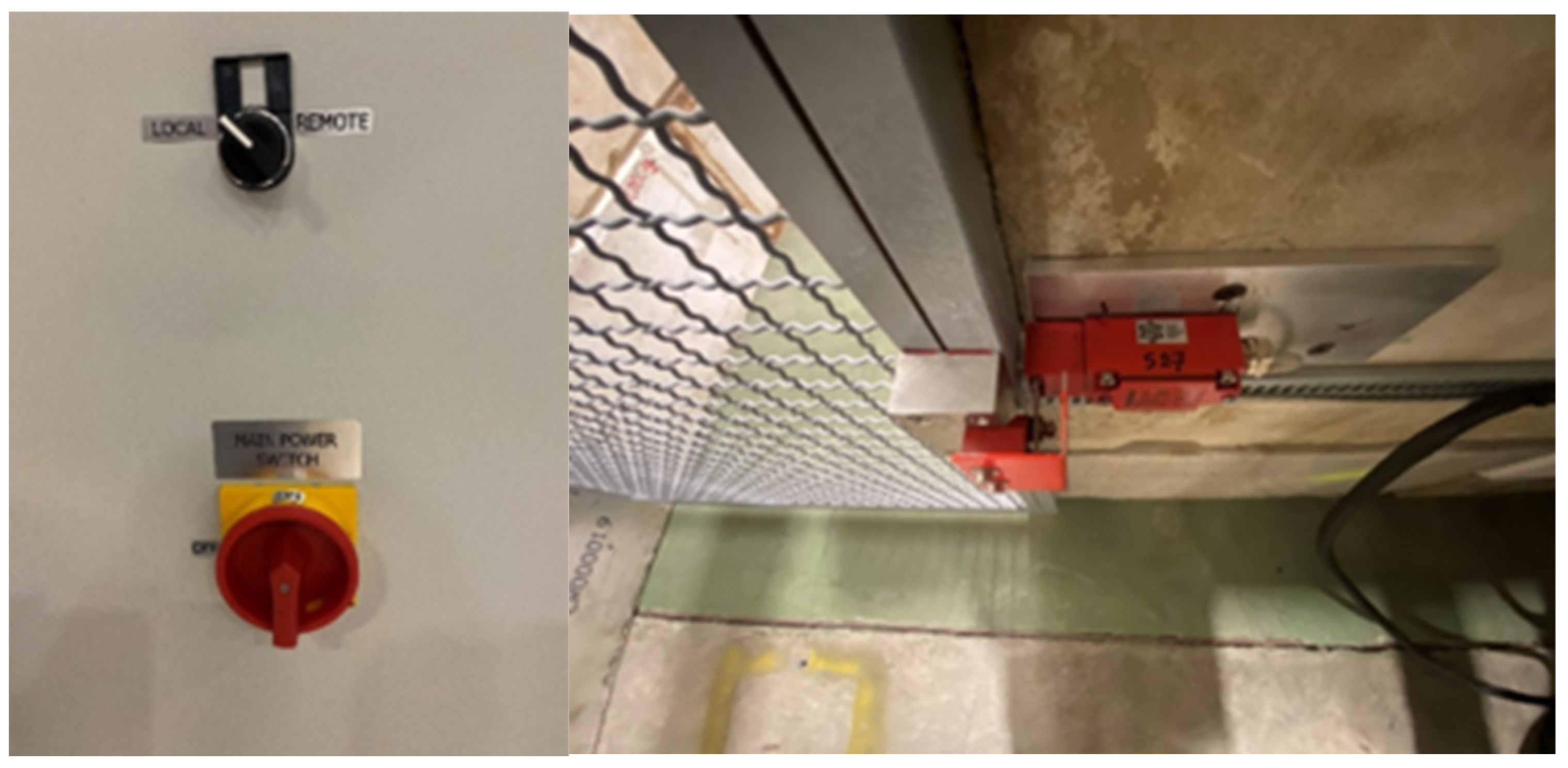 - The entrance door lock switch ( Figure 9- (right)) has two operating modes (switch on control box—see  Figure 4- (left) (No. 3) and  Figure 9- (left)). The first is “local” for using the control panel at the bunker, in which case the door can be opened while changing the position of the FPSD detector. The second is “Remote” for using the second panel in the “Counting Room” or using a computer in the “Control Room”. In this case, the door must be closed. When the system is in the “Remote” mode, the opening doors block the system and stop movement until an expert arrives and uses a reset button in the control box (see  Figure 4- (right) (No. 10)).