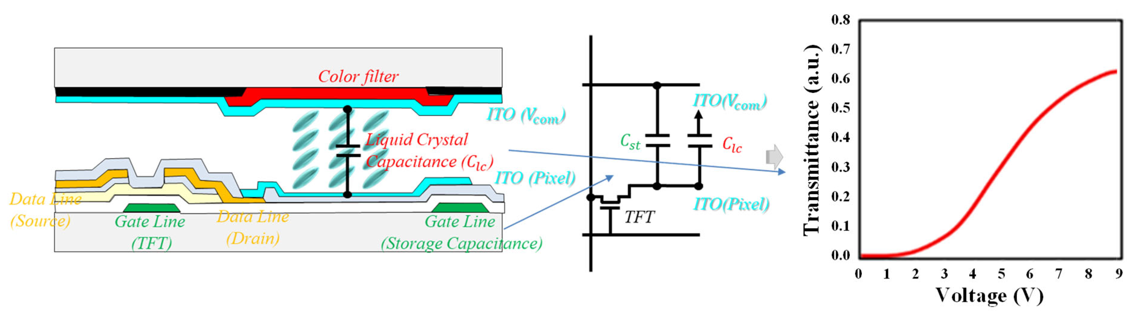 | Fringing electric fields from data line | Undesired distortion of the molecular tilt angle of the LC in the regions adjacent to the pixel’s data lines | Panel design with partial overlap between the data line and the pixel electrode |