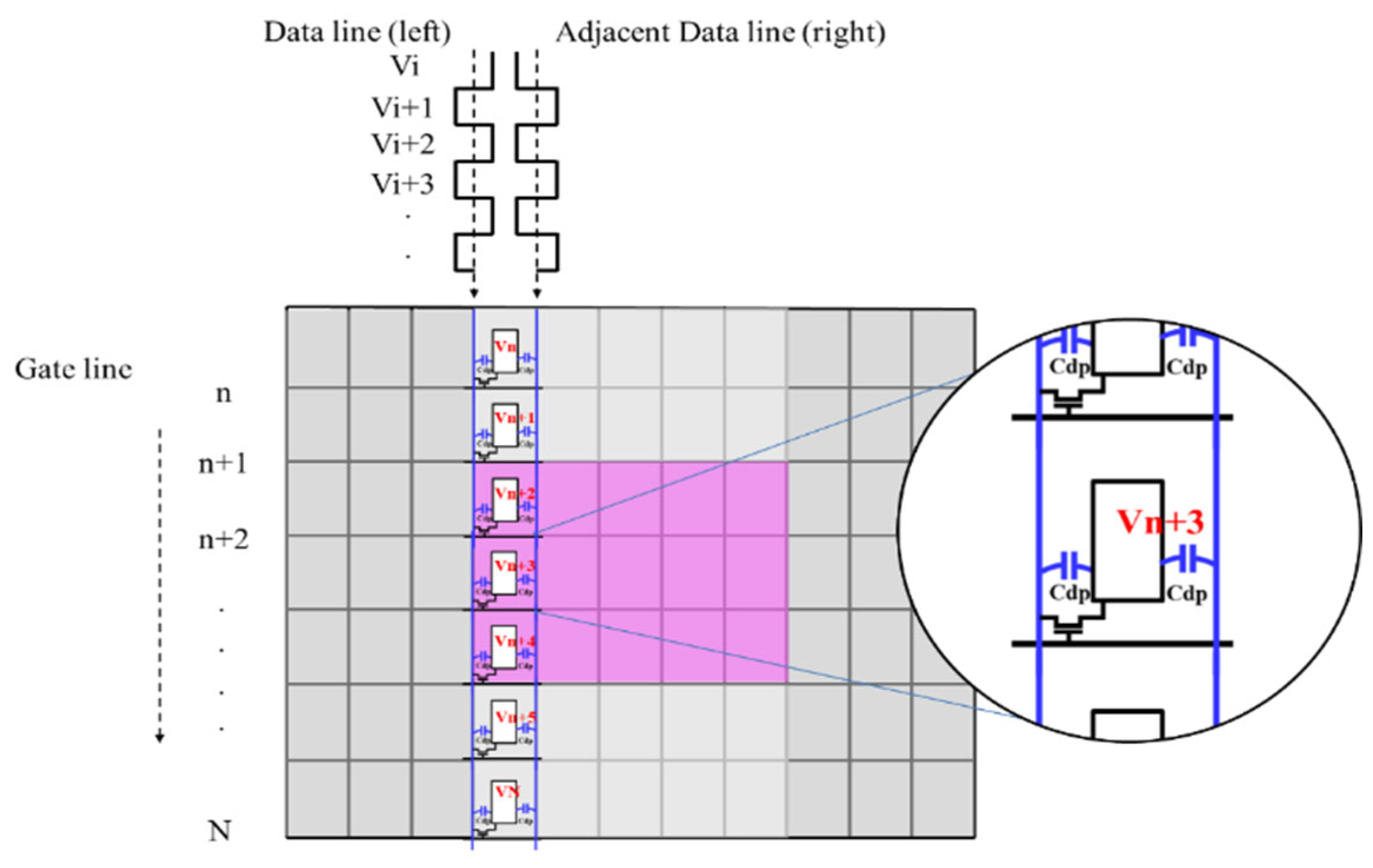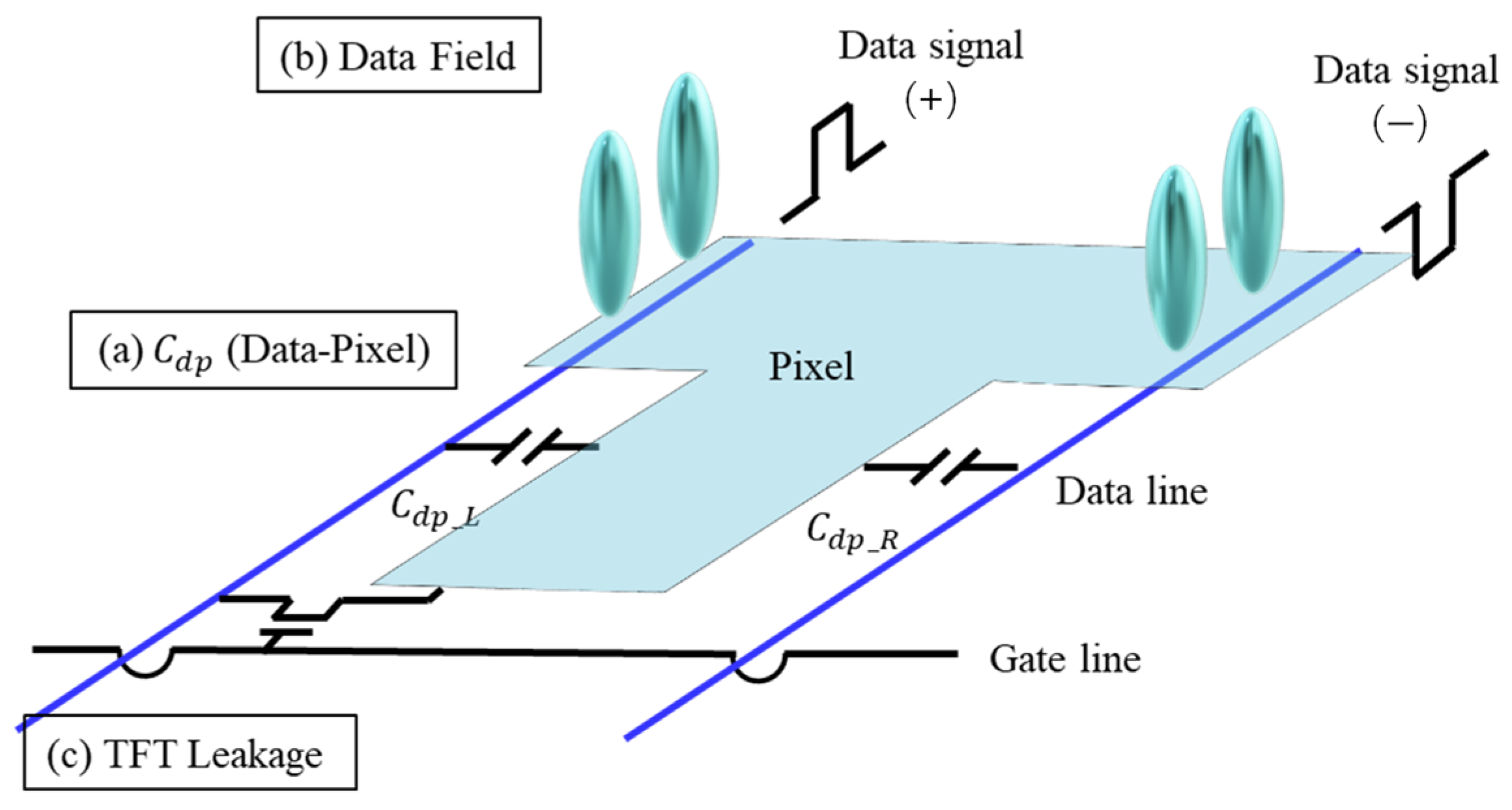 - Data line–pixel coupling: The capacitance asymmetry between the data line and pixel electrode (Cdp) can induce undesired variations in the voltages stored in the pixel storage capacitors and the resulting brightness fluctuations.