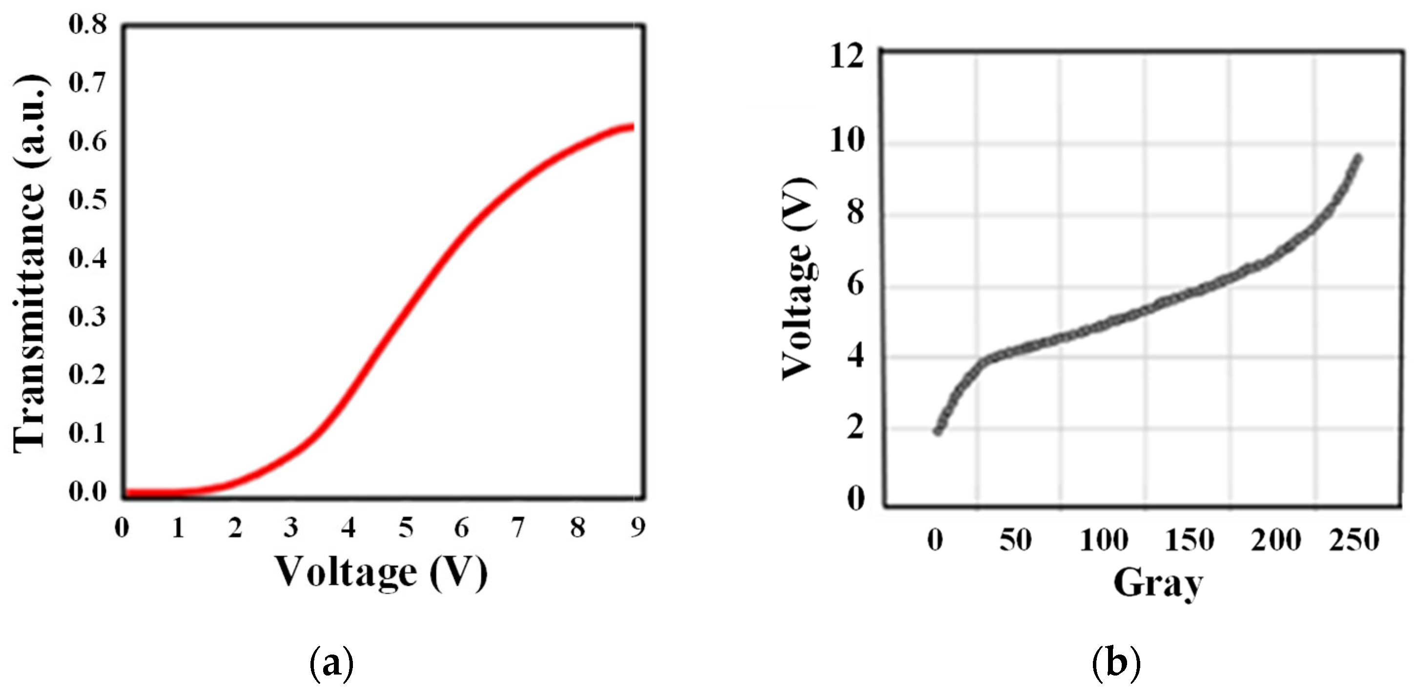 - Isomae, Y.; Shibata, Y.; Ishinabe, T.; Fujikake, H. Design of 1-μm-pitch liquid crystal spatial light modulators having dielectric shield wall structure for holographic display with wide field of view. Opt. Rev. 2017, 24, 165–176. [Google Scholar] [CrossRef]