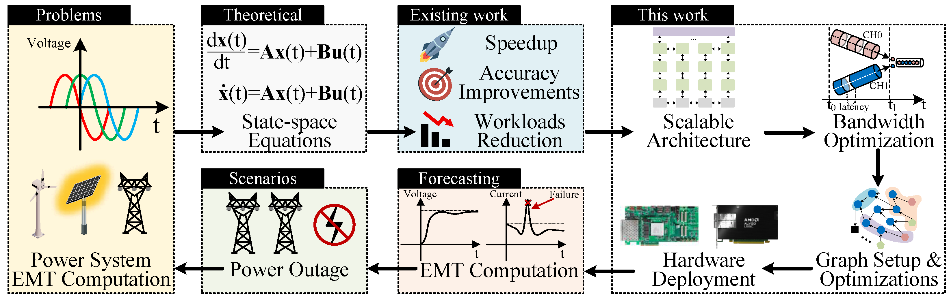 The overview of FPGA-accelerated EMT computation. This article focuses on accelerating large-scale EMT computation through systematic exploration of scalable hardware architecture and design optimization methods, particularly targeting state-space equations derived from power grid EMT models under power outage scenarios.