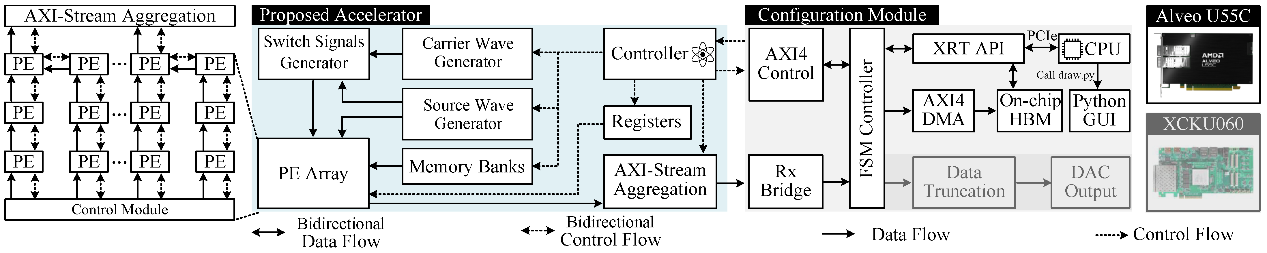 The overview of proposed hardware architecture. Our design can support traditional FPGAs with hardware in loop and advanced FPGAs with accelerator card framework.