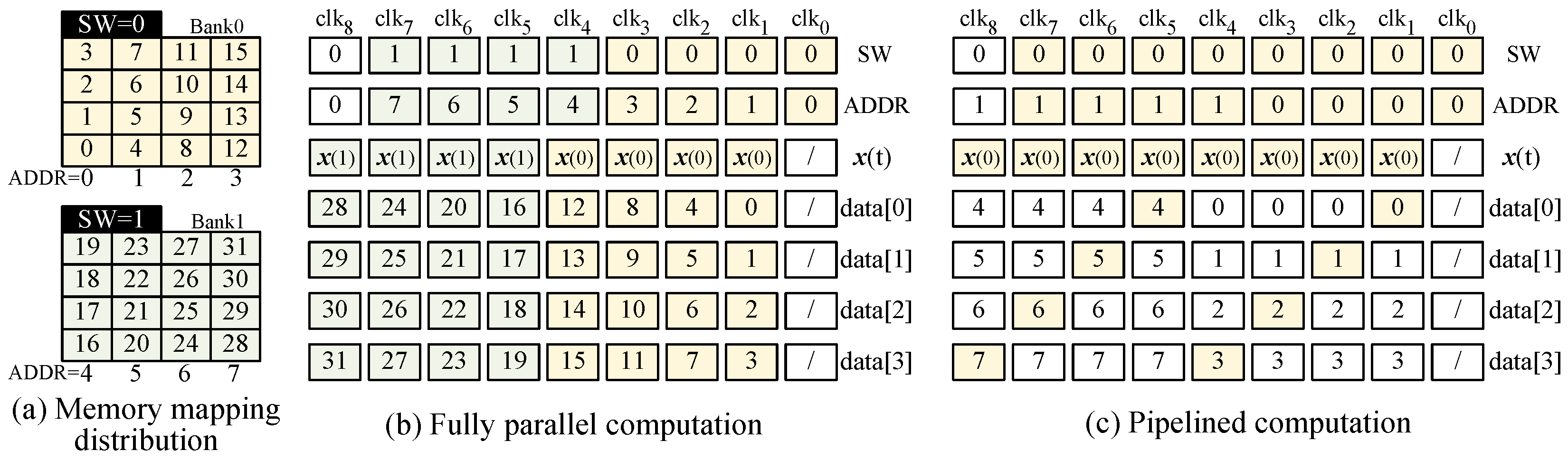 Example of memory mapping distribution and the computation workflow with different mode, where ADDR represent the start address in BRAM, SW denotes the 3-bit switch signal, and data[3:0] is responsible for stored column vector of coefficient matrices in the memory. The denotes the state vector at the t-th clock.