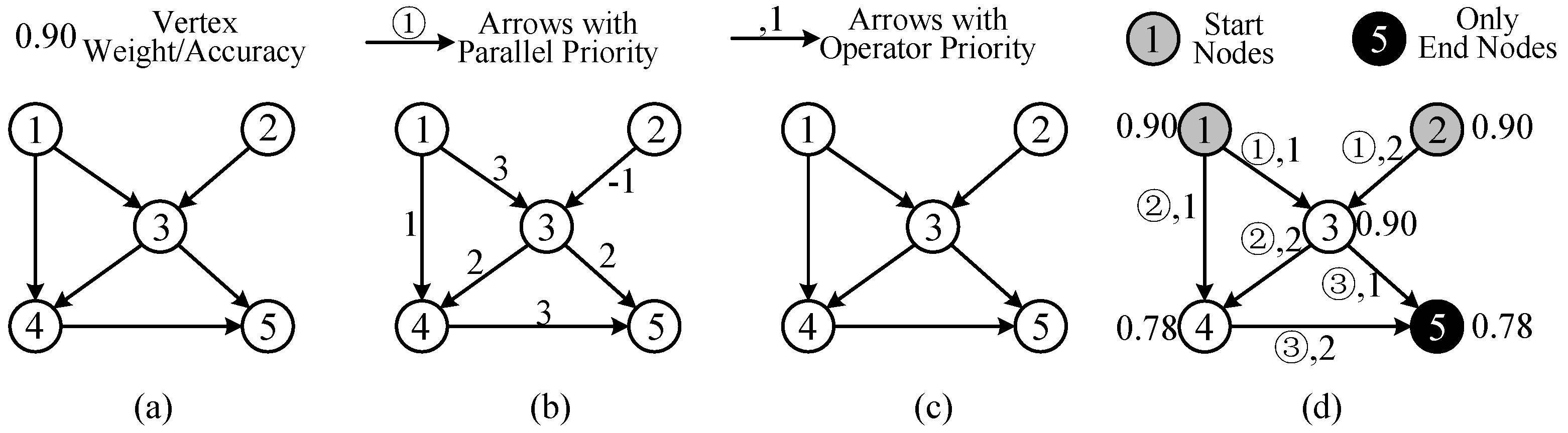 Topologies of graph (a), weighted graph (b), digraph (c), and (d) weighted diagraph with priority (WDP).