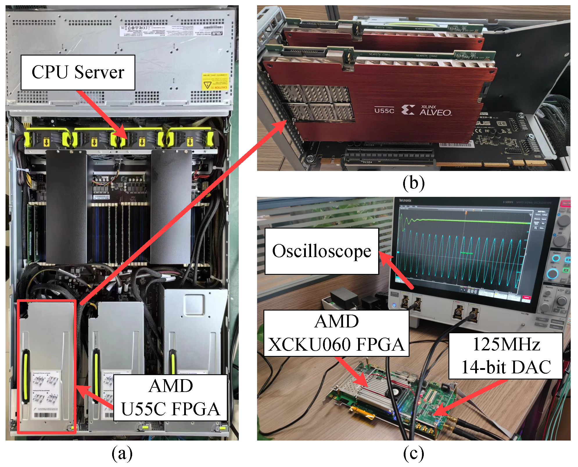 Real machine operation for real-time computation based on FPGAs. (a) FPGA-CPU heterogeneous system equipped with AMD Alveo U55C accelerator cards is used to deploy large-scale EMT computation. (b) U55C FPGAs are connected to CPU server by PCIe interface. (c) The high-performance XCKU060-implemented computation system with 125 MHz DAC.
