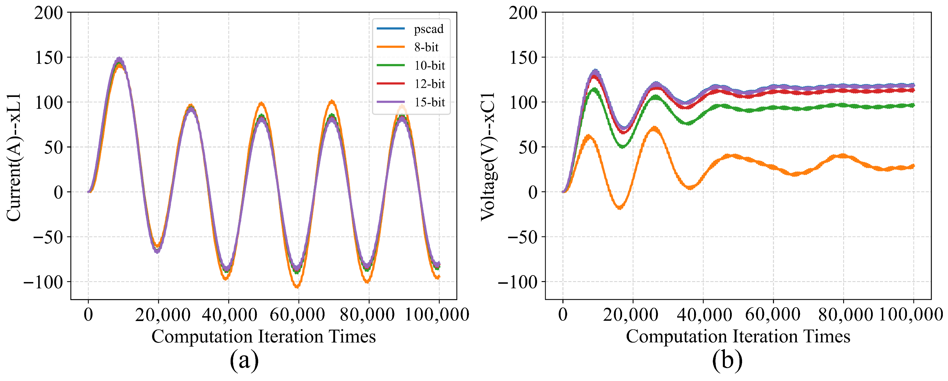 Quantization verification for state variables by MATLAB with various quantization widths. (a) The transient response of the state . (b) The transient response of the state .