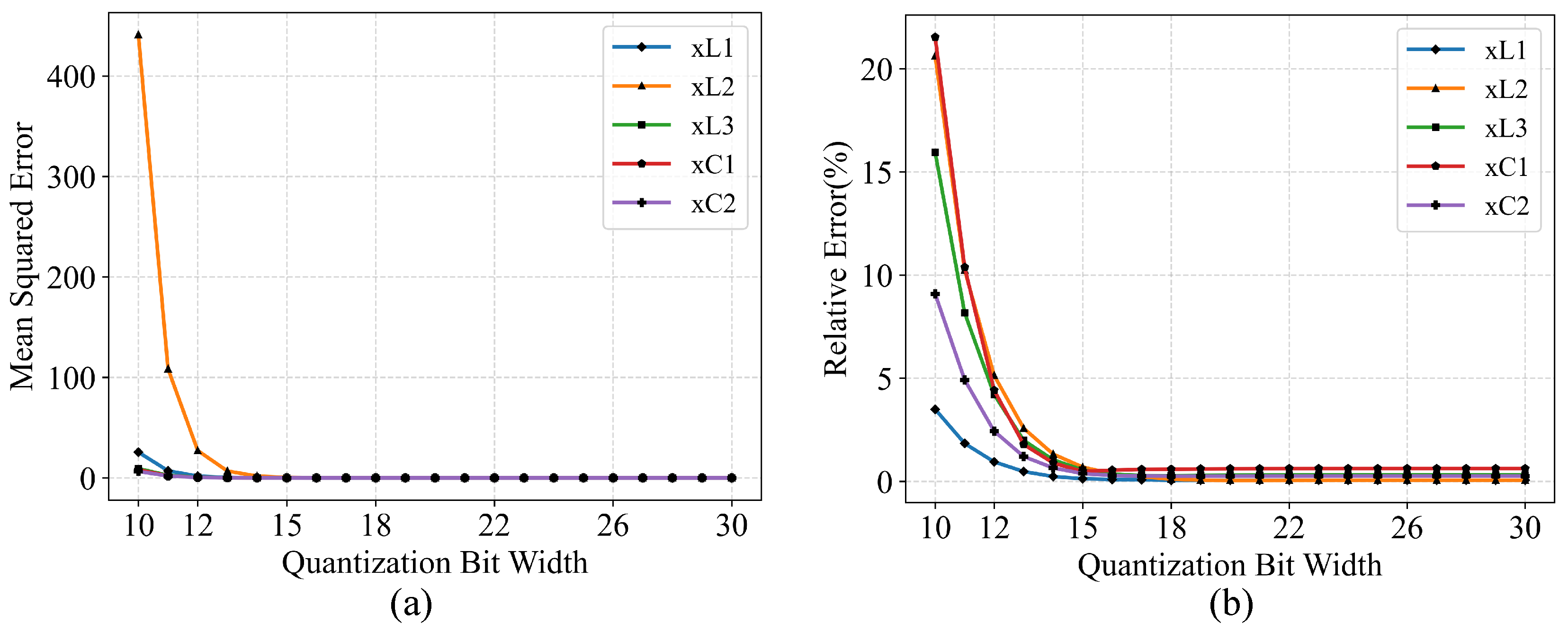 Quantization error for state variables by MATLAB with various quantization widths. (a) The relationship between the mean squared error (MSE) and the quantization bit width. (b) The relationship between the relative error (RE) and the quantization bit width.