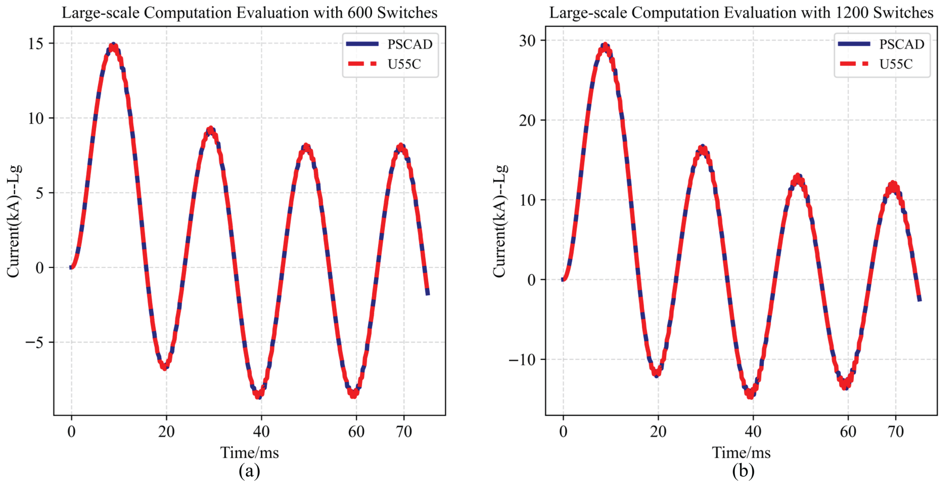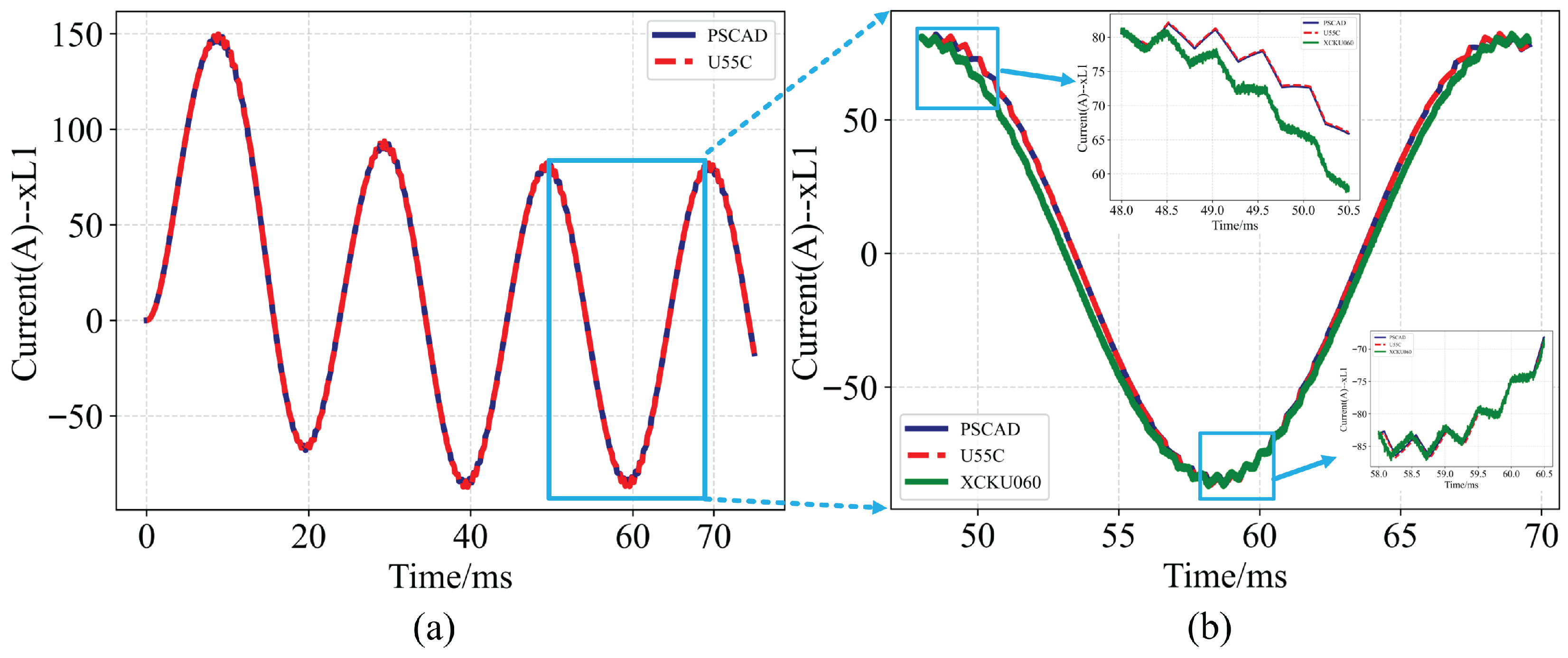 Waveform results of real-time power system computation. (a) A-phase current of the VSC. (b) Enlargement of A-phase current waveform near 60 ms in (a), including PSCAD results, U55C transferring data by PCIe, and KU060 outputting physical waveform by 14-bit DAC.