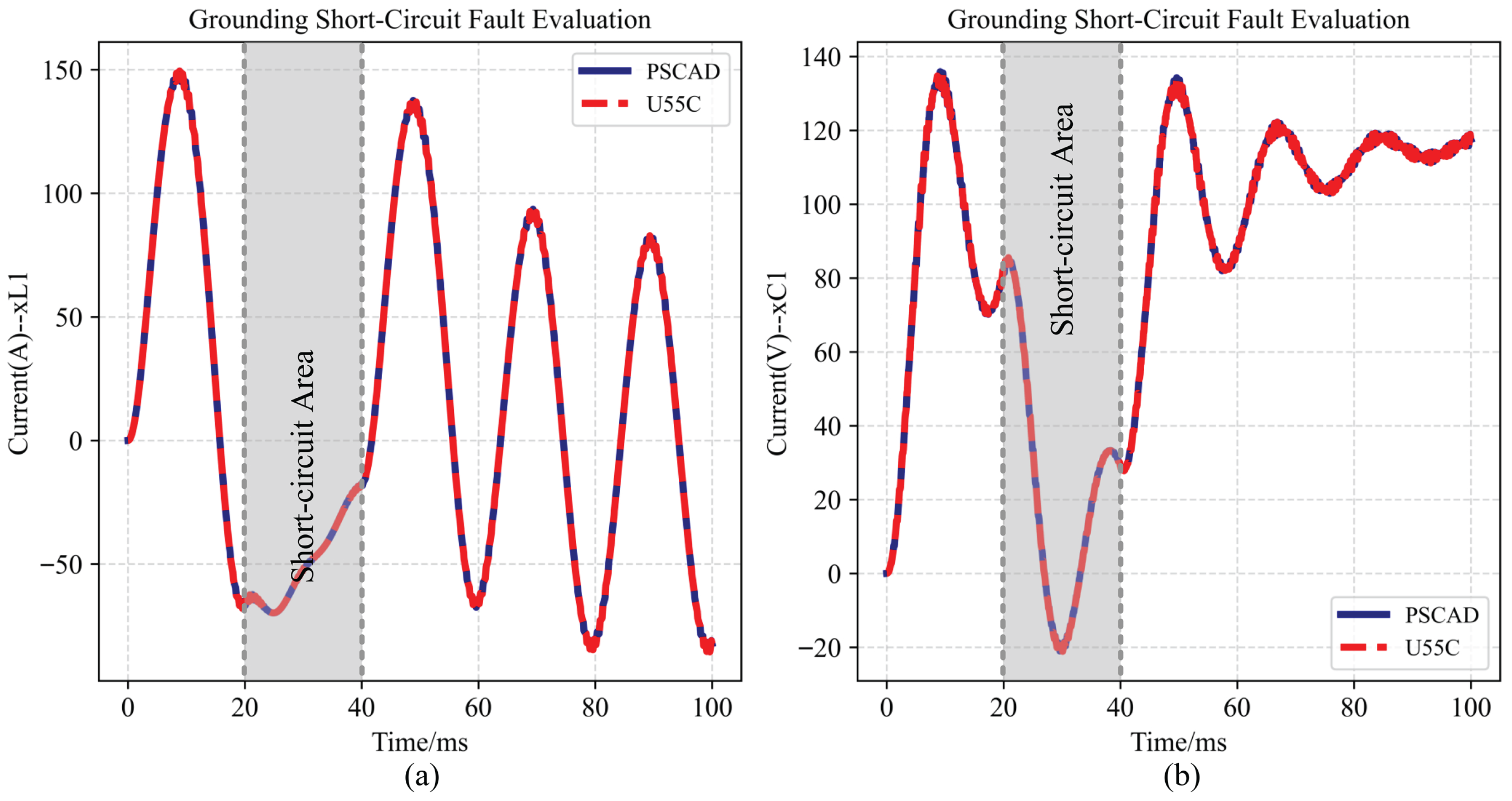 Grounding short-circuit fault evaluation. (a) The transient response of the state . (b) The transient response of the state .