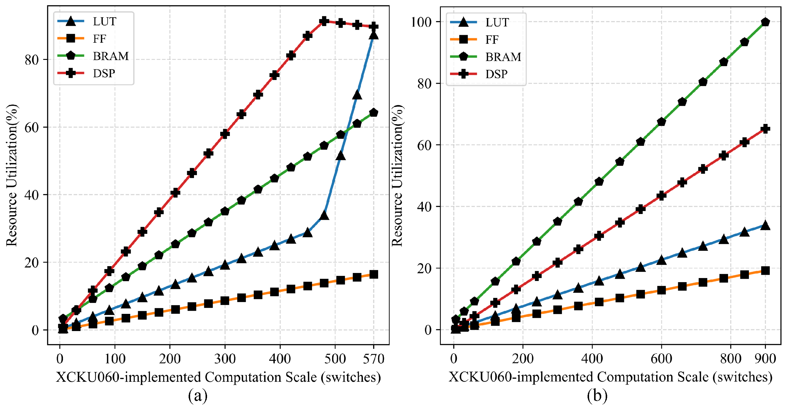 Relationship between resource consumption and computation scale. (a) FPGA-accelerated implementation obtains 53 ns ultra low latency and maintains 95 converters with 570 switches. (b) FPGA-accelerated implementation obtains 373 ns latency and maintains 150 converters with 900 switches.