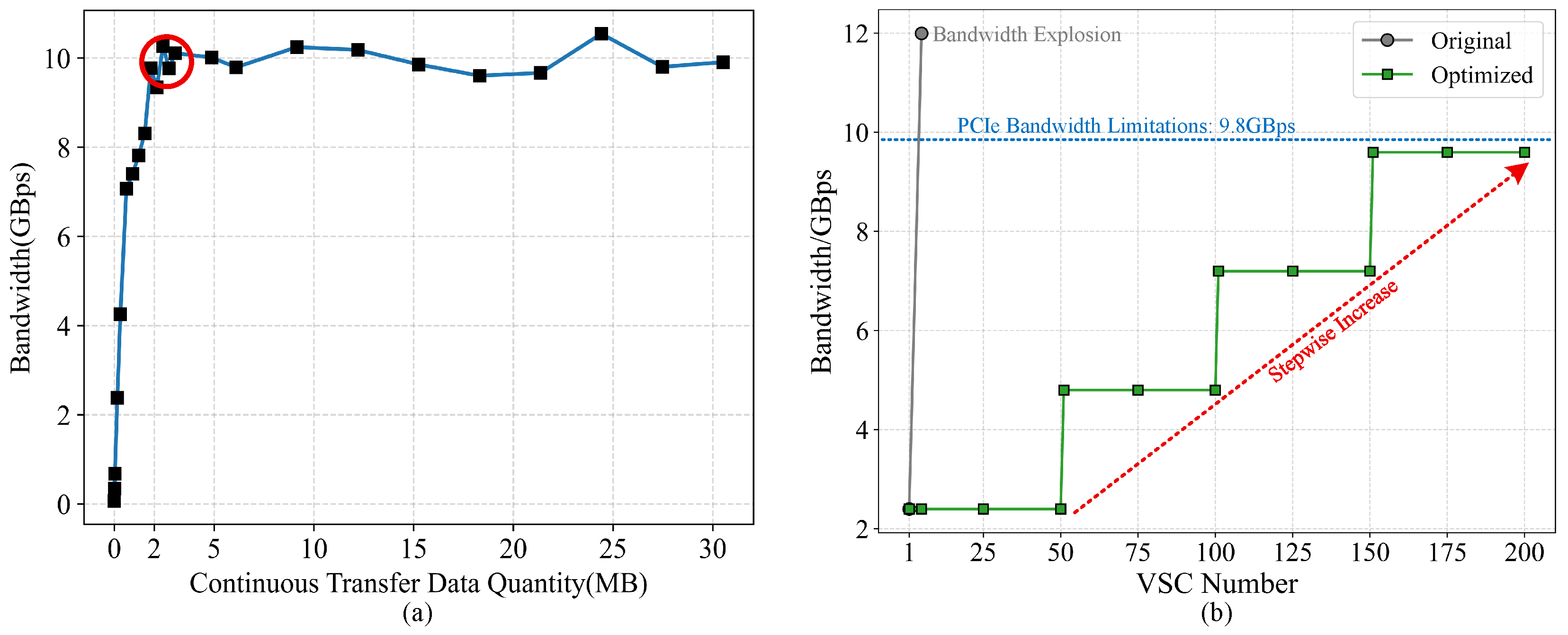 Bandwidth limitations. (a) The relationship between PCIe bandwidth and data transfer volume in U55C. (b) The relationship between bandwidth and the number of VSCs.