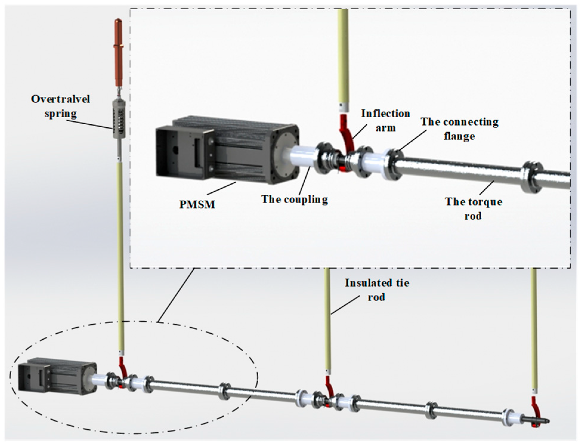 Figure 1; the load consists of two parts: the drive mechanism and the switch body. The drive mechanism contains the coupling, connecting flange, torsion bar, and brake disk, and the switch body contains overtravel spring, movable contact, static contact, and so on. The switching action is driven by the motor connected with the coupling, from the direction away from the coupling, clockwise for the breaking direction, and counterclockwise for the closing direction. The motor shaft is coaxially connected with the transmission spindle of the high-voltage circuit breaker, and the axis is horizontal and a fixed installation; the crutch arm is rigidly meshed with the transmission spindle, and the two of them do not rotate relative to each other during the whole movement process. The lower end of the insulating rod is hinged to the upper end of the arm through the pin, and the upper end is connected to the bottom of the movable end of the arc-extinguishing chamber. The arc-extinguishing chamber’s moving end consists of moving contacts and their connectors. With the arc-extinguishing chamber closed and vertical structure constraints, its movement in the modeling can be approximated only along the vertical direction of the translation.
