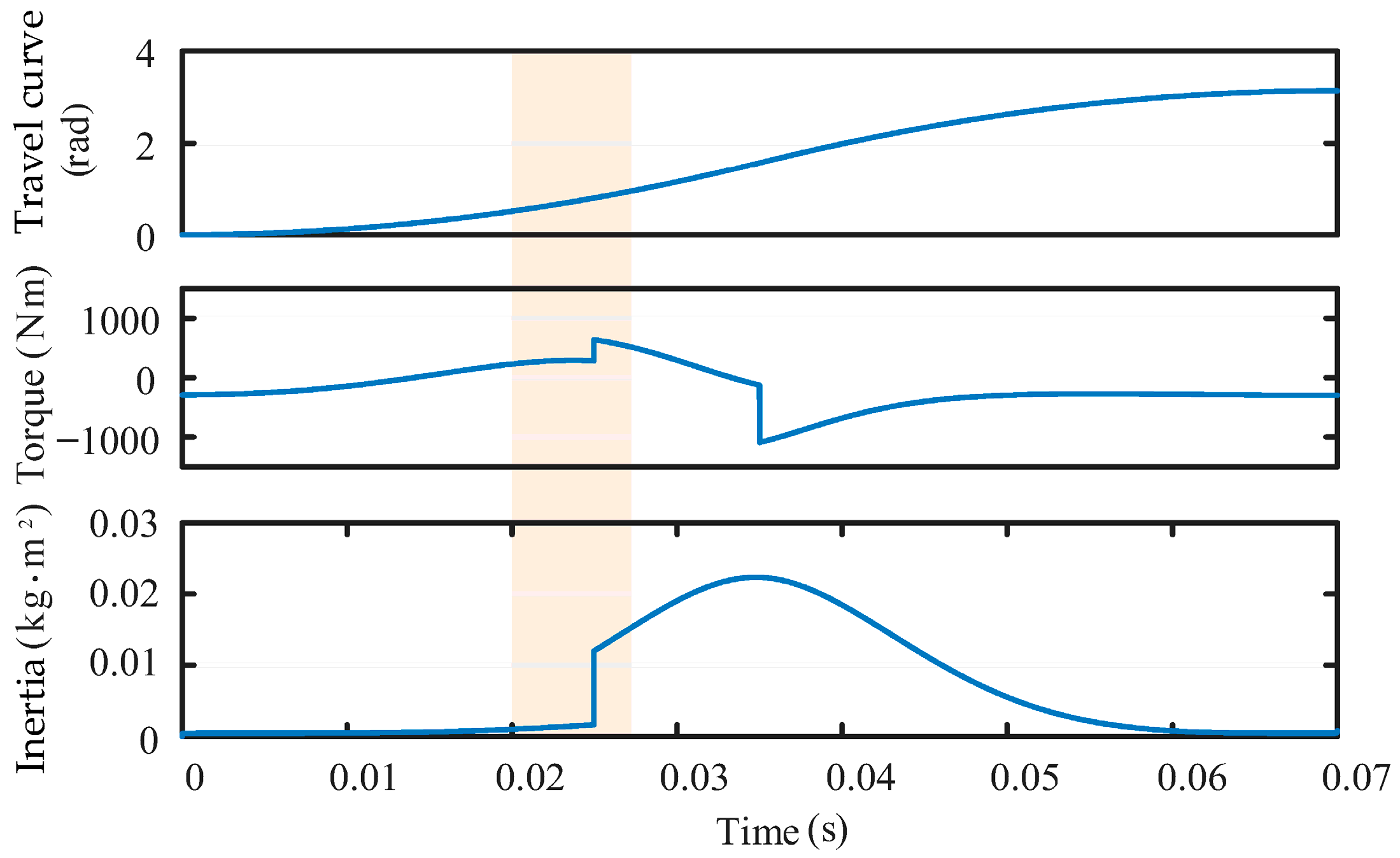 The torque  in Equation (1) is the variable to be solved, and in a set of prototype motor direct-drive high-voltage circuit breaker systems, all of them are known quantities except for the speed parameter; therefore, it is only necessary to substitute different motor travel curves to obtain the torque demand under different motor travel curves, which further aids the system analysis.