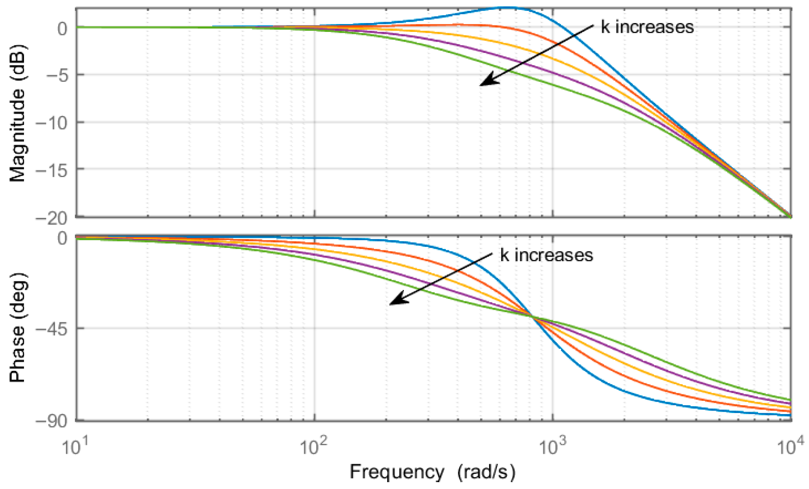 When , the characteristic Equation (10) has a pair of conjugate poles located in the left half-plane, and there are oscillations and overshoots in the speed loop in the case of a given step signal, and the degree of oscillations is inversely proportional to . Therefore, to improve the following performance of the speed loop, the value of  is generally not too small.
