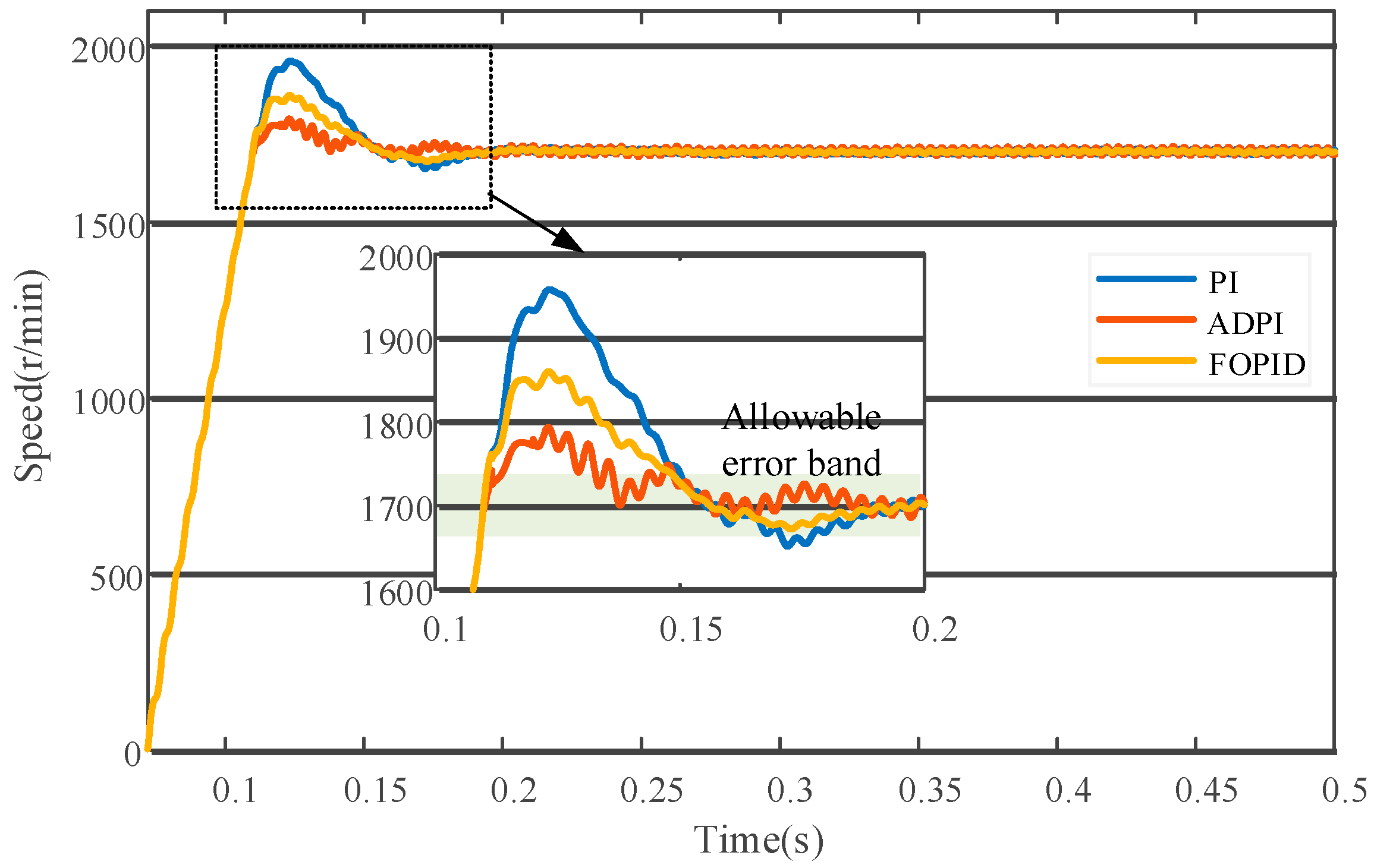 The speed loop performance using a conventional PI controller, a FOPID controller [