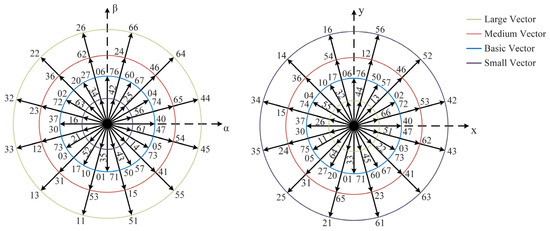 where Vdc is the DC bus voltage. From (10), it can be derived that all 64 voltage vectors include 60 effective vectors and 4 zero vectors (00, 07, 70, 77). According to the differences in vector magnitudes, the effective vectors can be classified into four categories, namely large vectors, medium vectors, basic vectors, and small vectors. The projection magnitudes of the effective vectors on the αβ and xy planes are illustrated in Table 1.