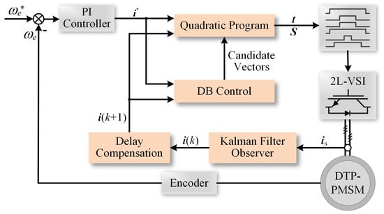 Motivated by the above, this paper proposes a multivector DMPC scheme for DTP-PMSMs that achieves favorable steady-state and transient performance while enabling effective harmonic current suppression. The proposed multivector DMPC scheme employs four active voltage vectors—two large vectors and two basic vectors—together with the zero vectors, to participate in implicit modulation. And the resulting control optimization problem is formulated as a quadratic programming problem that is suitable for real-time implementation. These enable accurate synthesis of arbitrary reference voltage vectors across the entire linear modulation region, along with effective control in the harmonic plane. These also enable obtaining a symmetric switching pattern with a single switching action per cycle during modulation, without the need for equal phase duty-ratio conversion. A fixed switching frequency equal to the control frequency is achieved. The proposed multivector DMPC scheme can effectively minimize torque ripple and xy-axis currents while ensuring good dynamic performance and low switching losses. In addition, a Kalman filter observer is incorporated into the control system to compensate for modeling inaccuracies and external disturbances, thereby enhancing the robustness of the control algorithm. Finally, the effectiveness of the proposed approach is validated through experiments conducted on a DTP-PMSM drive test bench.