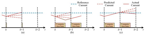 In an ideal DMPC algorithm, the current at time step k is collected, and the prediction model is then used to calculate the predicted current at time step k + 1. The optimal switching state is determined through the evaluation of a cost function and is immediately applied at the current time step k, as illustrated in Figure 4a. However, in practical applications, the computation time required for the control algorithm must be considered. The process of obtaining the optimal switching sequence involves multiple model predictions and cost function evaluations. This introduces a significant time delay between the current sampling instant and the application of the latest switching state, as shown in Figure 4b. Due to this computational delay, the actual current at time step k continues to respond to the control signal from the previous time step, while the optimal switching state obtained at time step k is not applied until time step k + 1. It can be observed that this delay causes the actual current to deviate from the predicted trajectory, increasing current ripple.