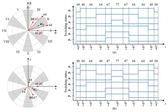 where is the reference current vector generated by the outer-loop proportional–integral (PI) speed controller. To synthesize the reference voltage vector within each control period, the αβ space vector plane is evenly divided into 12 sectors, and the sector in which the ideal reference voltage vector is located is identified. For each sector, two large vectors in the sector and two basic vectors from adjacent sectors are selected. The large vectors are chosen because they have the smallest magnitude in the xy plane, allowing maximum utilization of the DC-link voltage and reducing harmonic distortion. The basic vectors are selected because their switching states always include either ‘0’ or ‘7’, ensuring that each phase undergoes exactly one switching event per cycle. The selection of active vectors and redundant basic vectors for the 12 sectors is shown in Table 2.