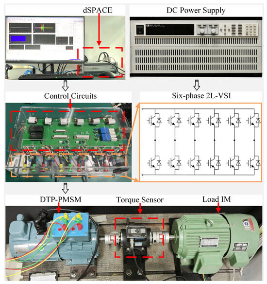 To verify the effectiveness of the proposed multivector DMPC scheme, the design and implementation of the electric drive setup based on a dSPACE MicroLabBox and an asymmetric DTP-PMSM fed by a six-phase 2L-VSI is shown in Figure 6. In addition, an induction motor (IM) is used as the machine load. The key parameters of the used DTP-PMSM and the experiments are listed in Table 4.