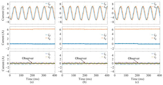 The motor drag experiments are conducted, considering only the effect of the inner current control loop. To verify the effectiveness of the Kalman filter observer in eliminating errors, experiments are conducted under conditions of magnetic flux or inductance mismatch. The system operates under the proposed multivector DMPC scheme, with a given load motor at 300 rpm and q-current of 6 A. The experiments are performed with magnetic flux φPM at 0.8 times and 1.2 times and dq-inductance L at 0.8 times the nominal values, respectively. As shown in Figure 7, the steady-state error of the q-current is −0.13 A, and the steady-state error of the d-current is 0.1 A when the magnetic flux is 0.8 times. At the same time, the steady-state error of the q-current is 0.15 A, and the steady-state error of the d-current is 0.1 A when the magnetic flux is 1.2 times. The xy-current in both cases has an amplitude of 0.5 A. When the dq-inductance is 0.8 times, the steady-state error of the q-current is −0.1 A, the steady-state error of the d-current is 0.15 A, and the amplitude of the xy-current is 0.7 A. After the observer is enabled, the observer effectively reduces the steady-state error of the dq-current and suppresses the harmonic current in the xy plane to 0.3 A which is caused by the parameter mismatch.