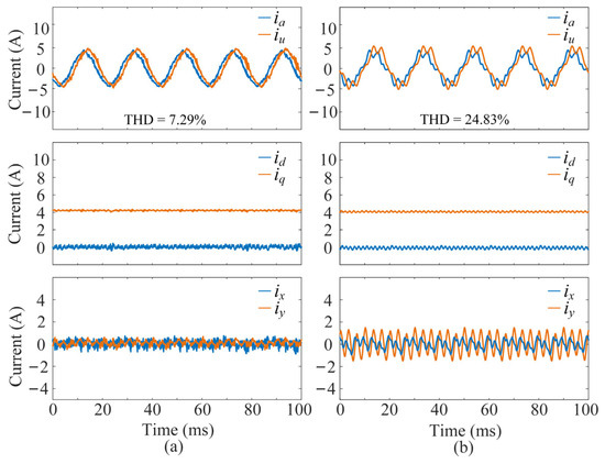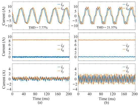 Steady-state performance results of the two schemes under a motor speed of 1000 rpm with a half-rated q-axis current of 4.2 A: (a) the proposed multivector DMPC scheme, (b) the FCS-MPC based on DVVs. From top to bottom: phase currents, dq-axis currents, and xy-axis harmonic currents.
