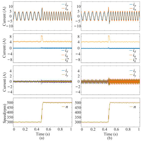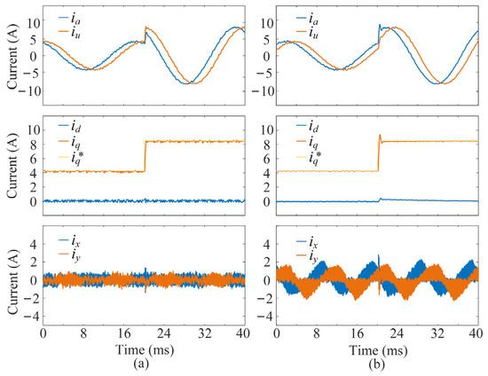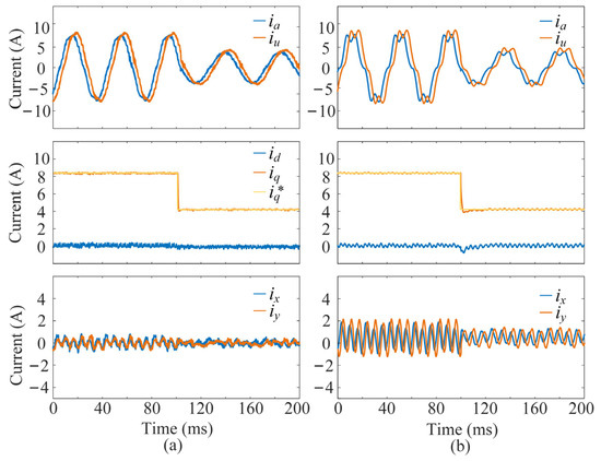 Transient performance results of the two schemes under a sudden increase in speed with the load of 10 N·m: (a) the proposed multivector DMPC scheme, (b) the FCS-MPC based on DVVs. From top to bottom: phase currents, dq-axis currents, and xy-axis harmonic currents.