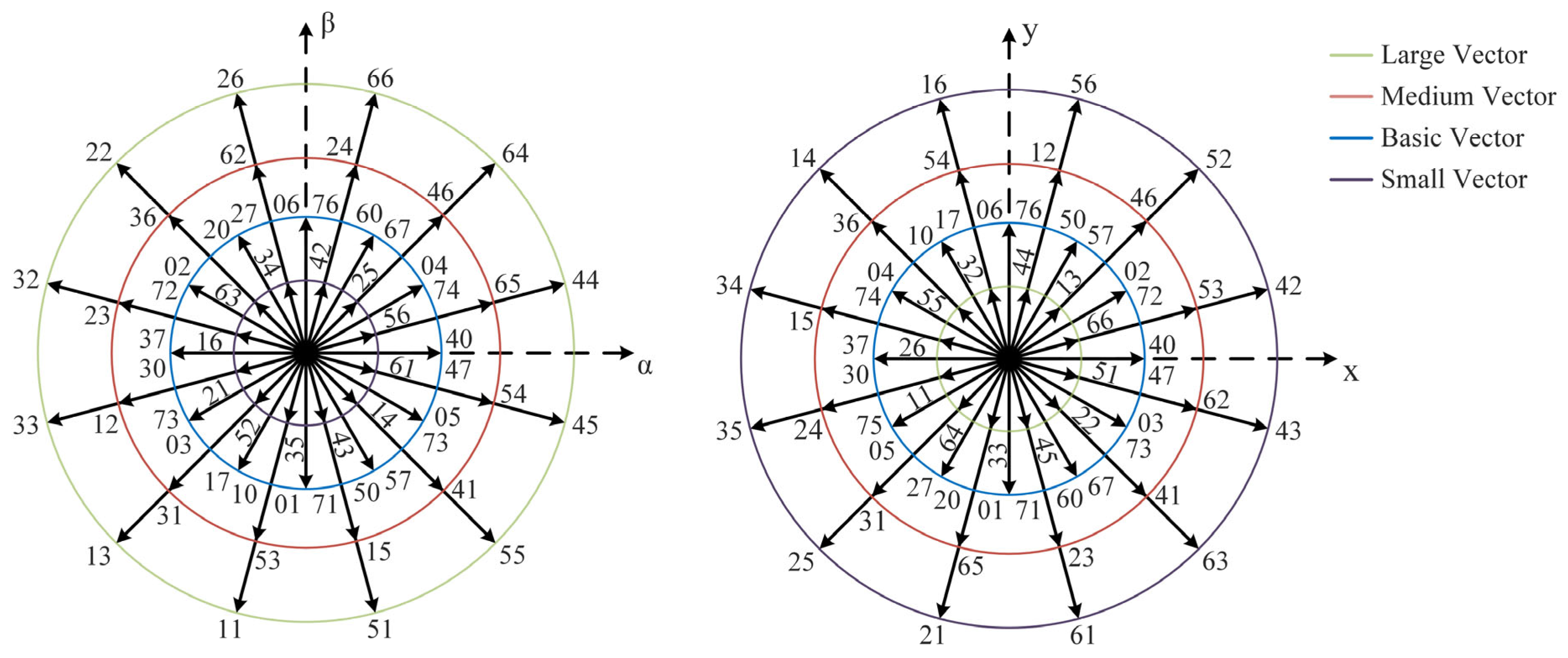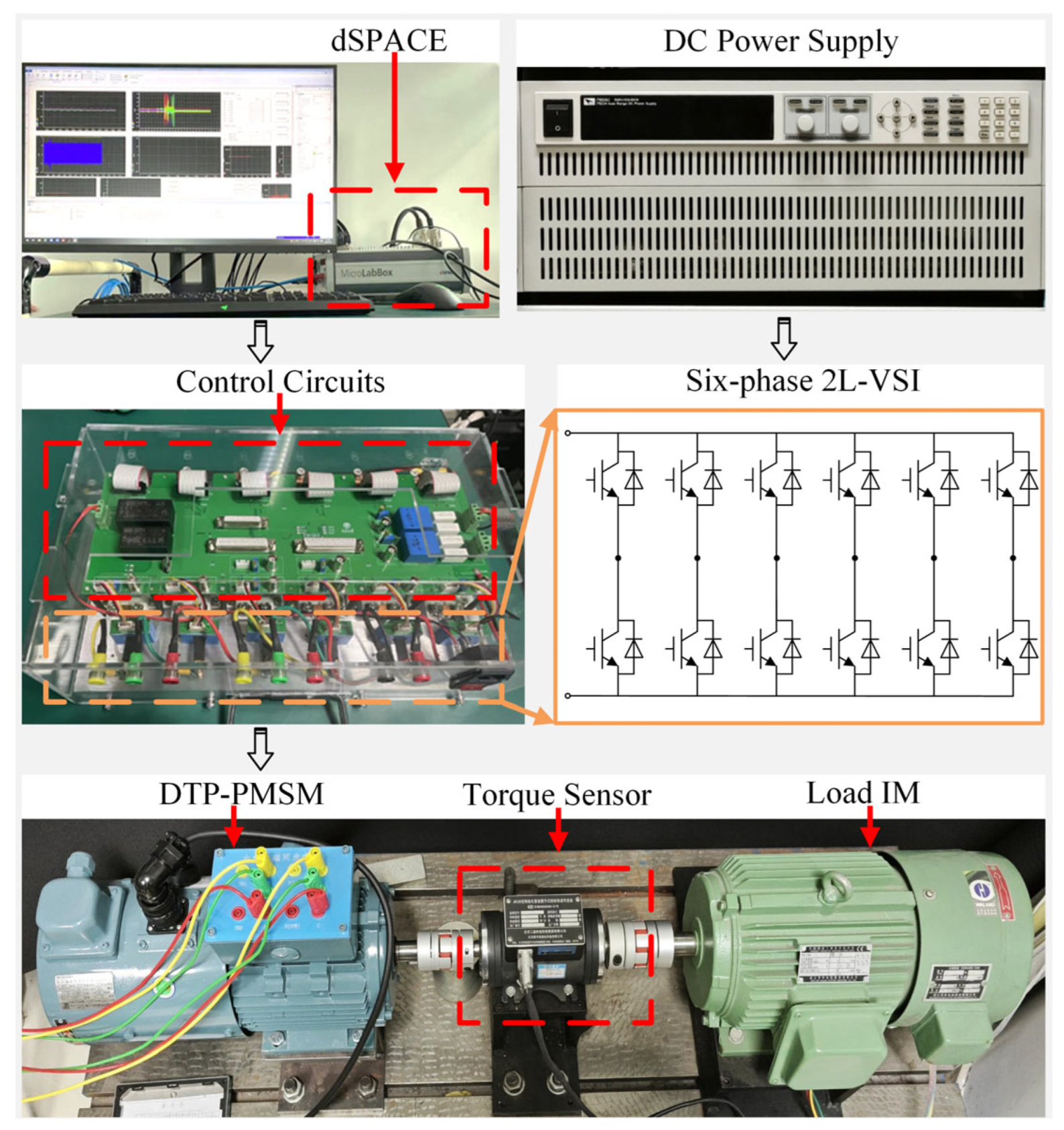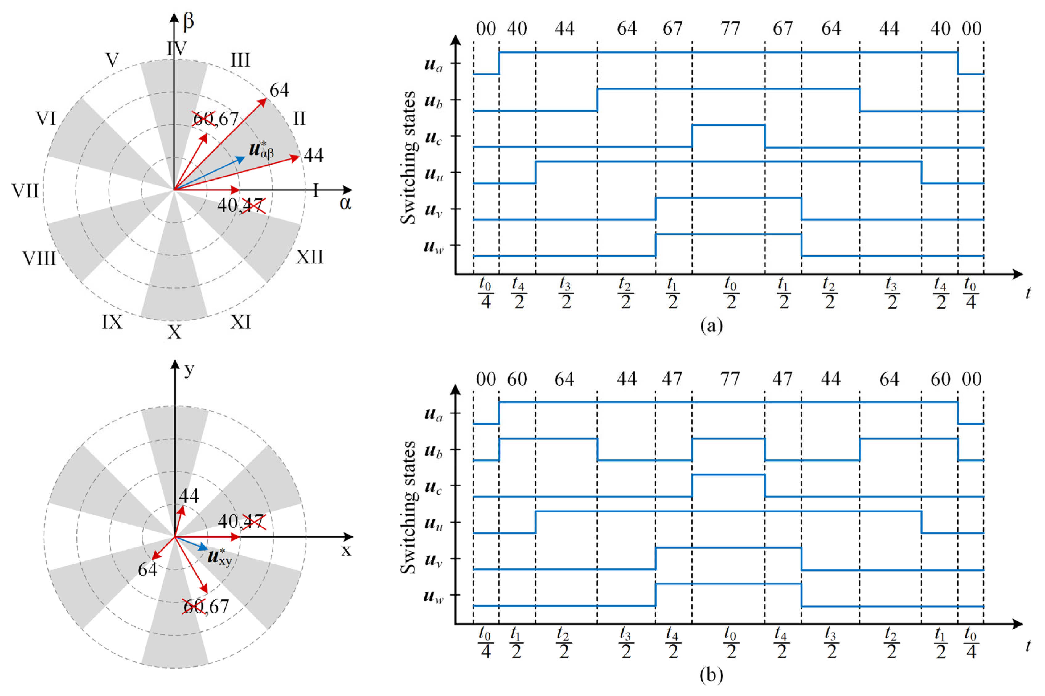 - Li, Z.; Liu, H.A.; Xia, J.; Gao, X.; Rodriguez, J.; Huang, Y.; Liu, Z.; Zhuang, Y.; Zhang, Z. A Novel Virtual Space Vector Modulation-Based Predictive Current Control for Dual Three-Phase Permanent Magnet Synchronous Machine. In Proceedings of the 2025 IEEE International Conference on Predictive Control of Electrical Drives and Power Electronics (PRECEDE), Nanjing, China, 5–8 June 2025; pp. 1–6. [Google Scholar]