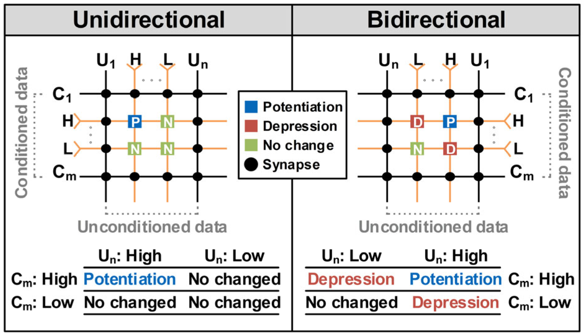 - Pedro, M.; Martin-Martinez, J.; Rodriguez, R.; Gonzalez, M.B.; Campabadal, F.; Nafria, M. An unsupervised and probabilistic approach to Pavlov’s dog experiment with OxRAM devices. Microelectron. Eng. 2019, 215, 111024. [Google Scholar] [CrossRef]