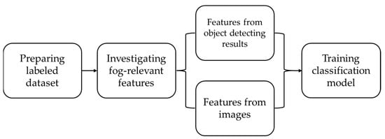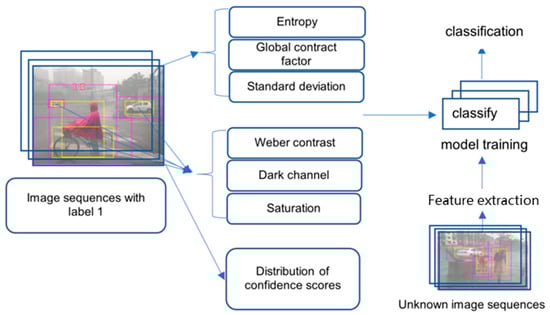 As outlined in Section 3.2. on feature extraction for fog-relevant attributes, the features of an image are extracted on both global and local scales. Subsequently, the average fog-relevant features across all images within a sequence are determined and designated as the defining features of that image sequence. To attain a reliable distribution of object detection scores, the kernel density estimation algorithm is applied uniformly to all the objects present within the image sequence. The aforementioned features are collectively incorporated to constitute the feature space. The labels assigned during the synthesis of the foggy datasets are leveraged as corresponding sequence labels. The support vector machine model, being the most prevalent supervised machine learning model for two-class classification tasks, is selected for classifying fog densities due to its ability to discern between separate classes with a maximal margin of separation.