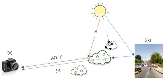 Figure 2 and the equations above show the formation model, where I(x) is the foggy image captured by the imaging system; J(x) is the corresponding clear image; x is the position of every pixel; t(x) is the ratio mentioned above, which is called the transmission function and depends on the depth of scene point d(x) and medium attenuation coefficient ; and A is the horizon radiance, called atmospheric airlight.