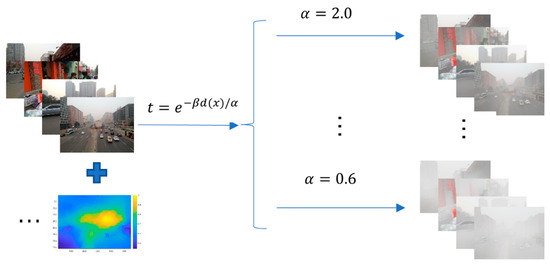 To solve this problem, we synthesize foggy images with different densities from clear images by controlling the elements in the physical model mentioned in Equation (1). The fog density can be changed by the overlying airlight, which is global airlight A and transmission t(x). In this paper, we change the exponent in transmission in Equation (2) and introduce a new parameter α, as presented in Equation (3):