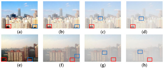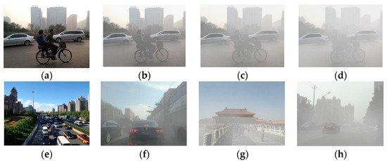 Visual effects of different fog concentrations in various scenes from images (a–h).