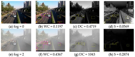 The local features of an image are extracted by calculating the mean of all objects for images with objects. In Figure 6, the local region is chosen for the clear image (a) and foggy image (e). Some regions with cars are selected to calculate the Weber contrast, dark channel, and saturation. The Weber contrast is smaller for foggy image (e). In image (c), the car areas are dark except for a white car, and in image (g), all these areas have large values in the dark channel. The local saturation of clear and foggy images is shown in images (d) and (h). It has the opposite behavior to the dark channel.