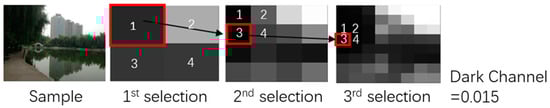 Object position information is not usable when there is no object in the scene. To extract local features, we select the target region from large to small scales. As is shown in Figure 7, taking the dark channel as an example, first, we divide the original image into four patches using the same-sized square, and then every patch is divided into four smaller ones. This division is performed three times to form 64 small patches, from which we will select one patch of interest. Second, we choose the region with the minimum dark channel value as the target region from the first division, which is patch 1. We continue to select the minimum dark channel value in patch 1 of the first division, which is patch 3. Then, the patch with position (4, 1) in patch 3 of the second division is selected as the final region for feature extraction. We calculate the maximum saturation feature for an image in this way.