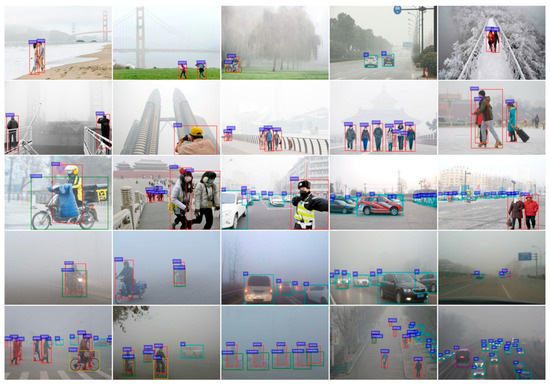 The initial dataset is based on the RESIDE-beta OTS [24] dataset. This dataset contains 2061 real outdoor images from Beijing under real-time weather conditions, and it uses deep learning algorithms to reduce depth errors and potential visual forgery, including images with haze as well as clear images. To ensure the diversity and realism of the dataset, clear images are used to generate haze images by simulating scenes under different fog densities. By applying the methods mentioned in Section 3.1, the final dataset is divided into three parts. The first part includes 593 images with massive objects and a similar scene depth to estimate the distribution of object confidence scores in different fog densities. Part two includes 3000 images as a training set to extract features and train the prediction model. Part three includes 600 images as a test set to test the classification model.