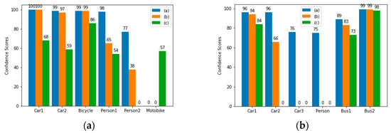 Object confidence of two scenes from Figure 12. (a) corresponds to the pictures in the first row; (b) corresponds to the pictures in the second row.