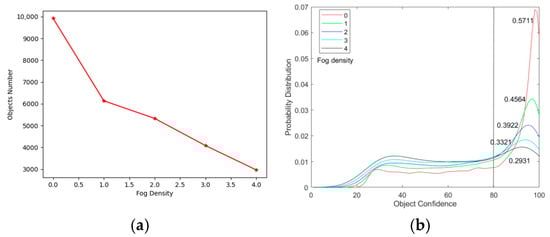 Object detection results for five datasets with fog densities of {0, 1, 2, 3, 4} synthesized from part 1 of the initial dataset. (a) denotes the difference in the number of targets; (b) denotes the differences in the probability density distribution of the target confidence level.