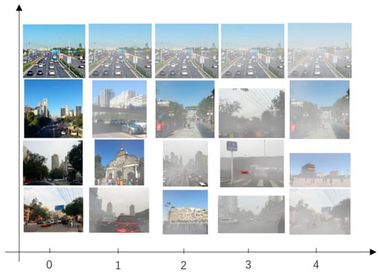 Figure 15 visually demonstrates the results for the image sequences extracted from the test set. Each column comprises a segment of an image sequence that belongs to the same prediction label. From left to right, the fog density escalates from 0 to 4. The initial row showcases images sourced from established foggy datasets, with densities ranging from 0 to 4, serving as a visual benchmark for the subsequent images. As the fog density intensifies, the prevalence of the overlying gray tone expands, and the intricate details gradually merge into the fog.