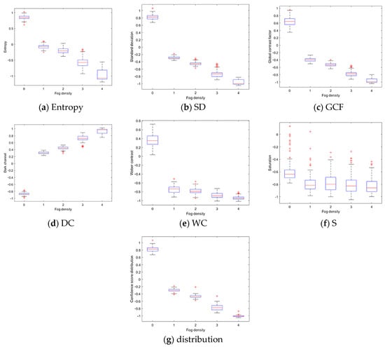 In Figure 16, a box–whisker plot is used to present the statistics of seven features for five fog densities after prediction using the test set. It plots the minimum, maximum, median, first quartile, and third quartile. From Figure 16, the local maximum saturation is not a good selection feature for the test set because the differences among the five densities are not clear and the features are all dispersed. Also, there are too many outliers. The global contrast, dark channel, and distribution of confidence scores are the ideal features. Local features like the dark channel and Weber contrast are more accumulative than global features when the fog density is great. This can help offset the adverse effect brought by the content of images.