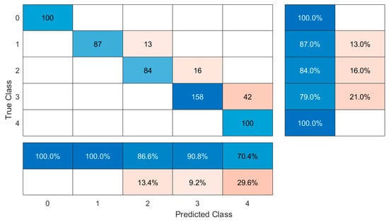 For the test set, we present the model prediction results. The test set has five densities: {100, 100, 100, 200, 100}. A comparison between the predictions and the true labels and the classification results are shown by the confusion matrix in Figure 17. The horizontal axis represents the predicted class, and the vertical axis represents the true class. The dialog shows samples that are predicted correctly. The total accuracy for all the samples is up to 88.2%. For the five fog densities, the precision is {100%, 100%, 88.6%, 90.8%, 70.4%} and the recall is {100%, 87%, 84%, 79%, 100%}. TP, FP, and FN are the number of samples that predict positive to positive, negative to positive, and positive to negative, respectively. From Figure 17, we can see that precision and recall decrease as the density gets greater. Because the features are similar when the fog is very heavy, the model classification capability decreases. Moreover, our model tends to classify density to the adjacent greater density.